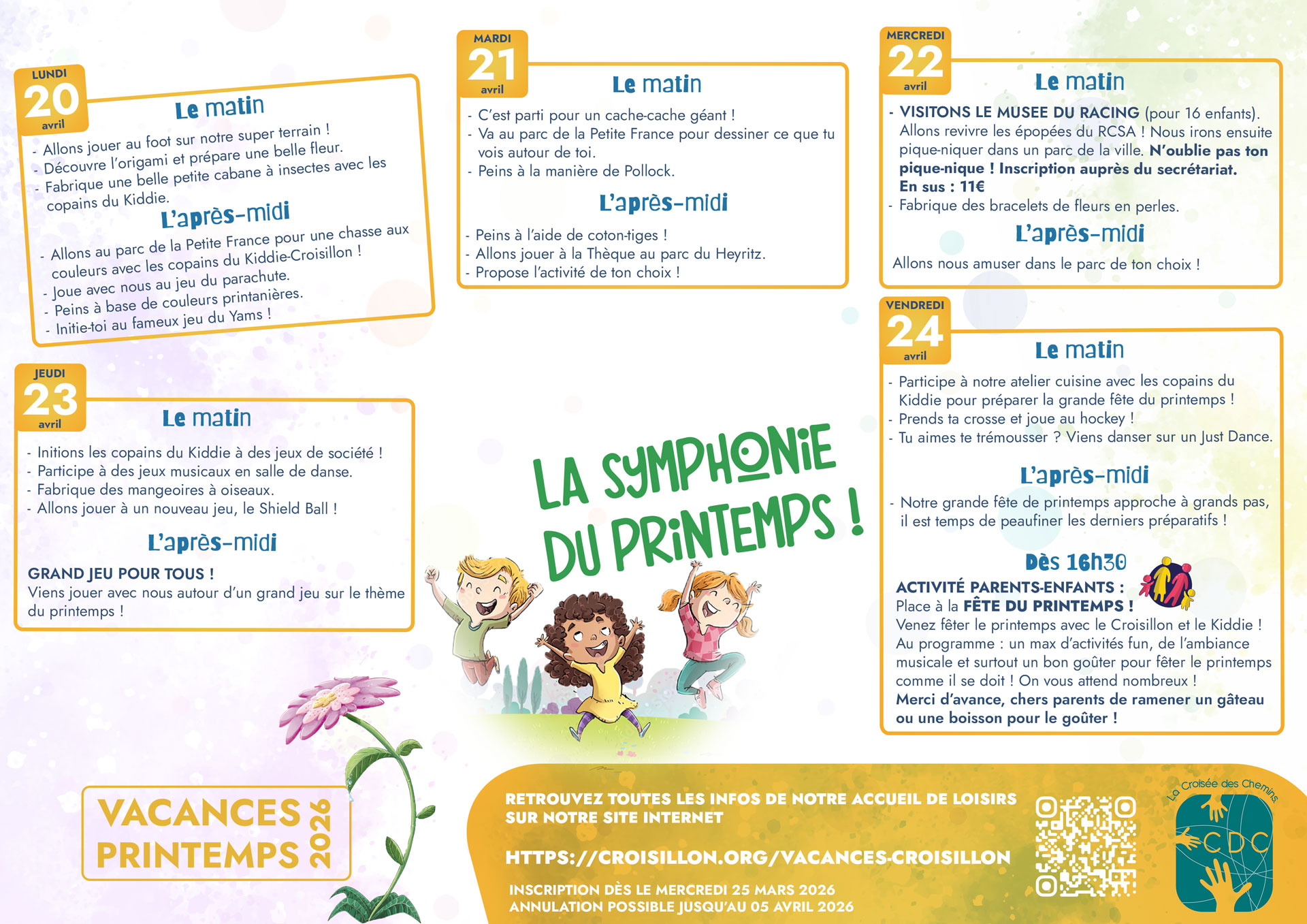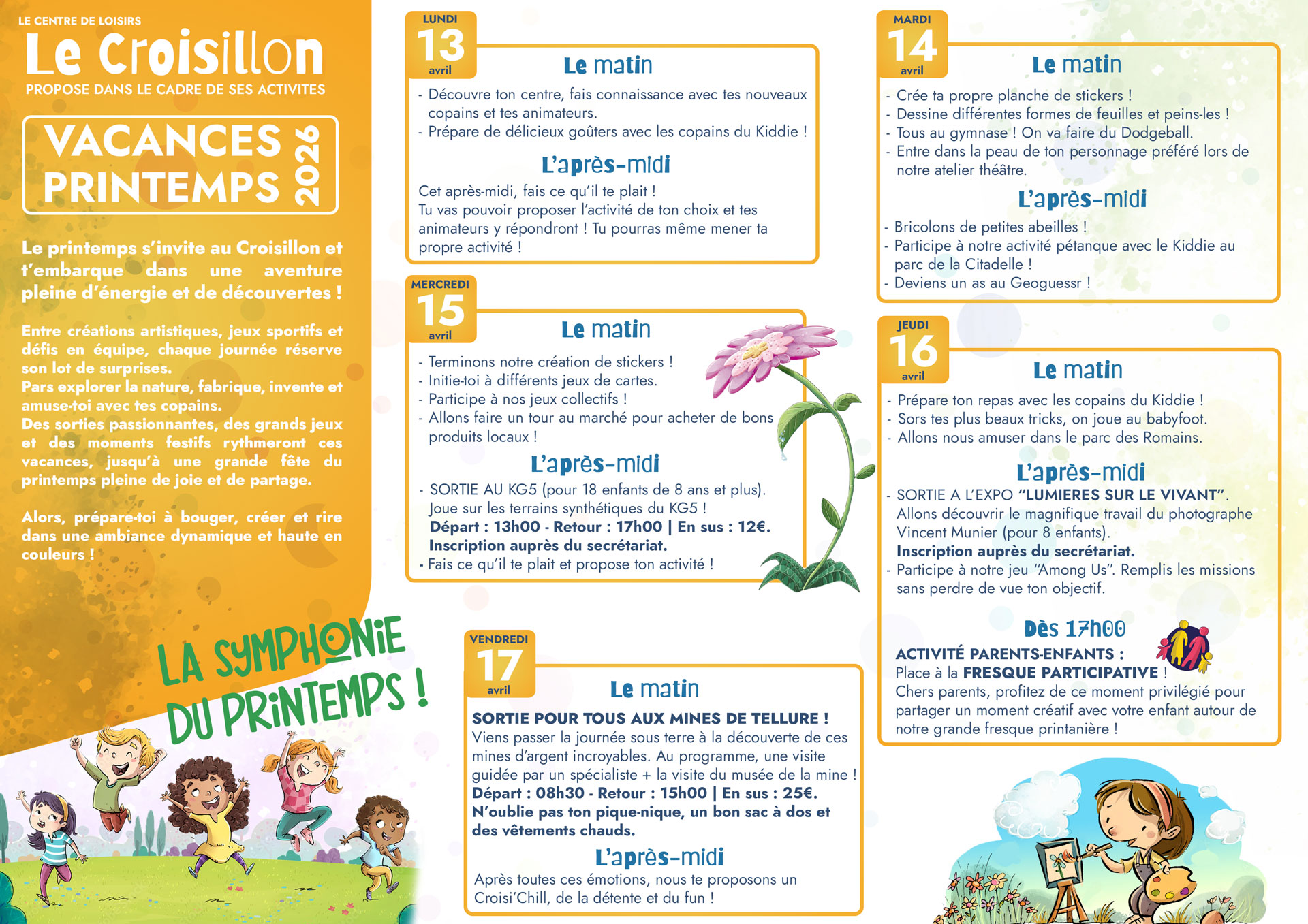 Pendant les vacances scolaires, Le Croisillon propose à vos enfants des journées actives, créatives et joyeuses. Au centre de loisirs, chaque semaine est pensée pour offrir un bon équilibre entre jeux, ateliers variés (cuisine, bricolage, vidéo…), sorties, moments de détente et vie en groupe.
