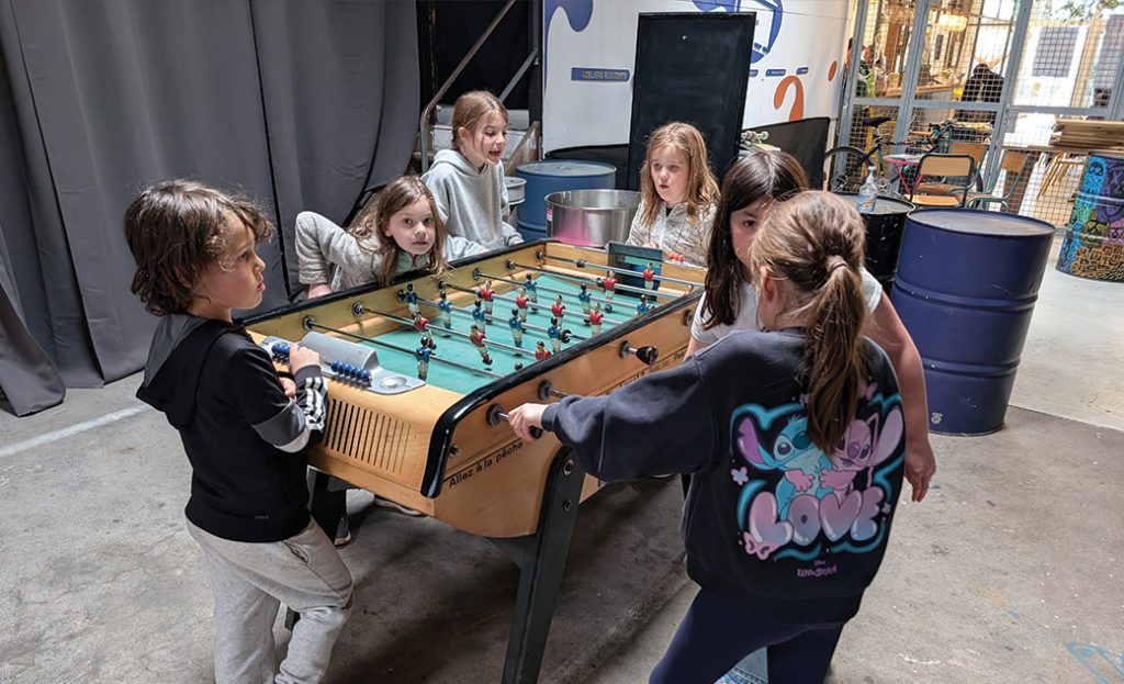 La visite s’est poursuivie à l’extérieur, où les enfants ont observé un petit jardin avec ses aromates, des abeilles solitaires et des façades entièrement décorées de street art. La journée a été rythmée par des moments conviviaux : jeux au parc, pique-nique en terrasse et match de babyfoot.